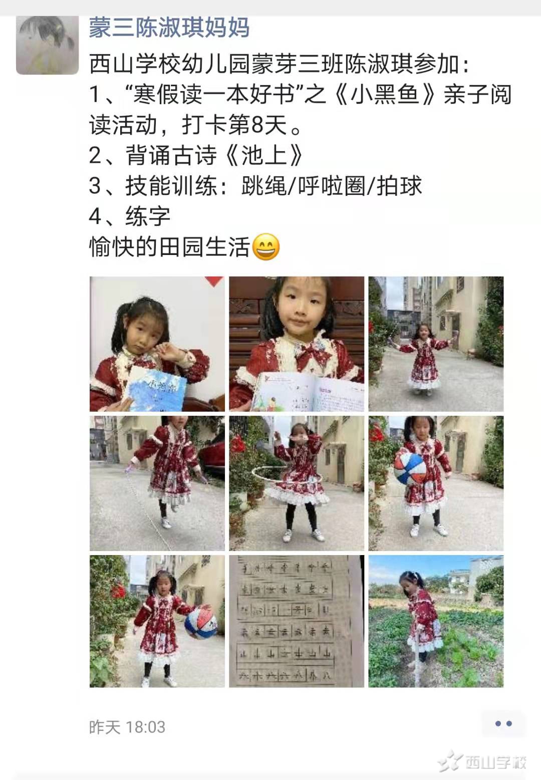 家长们每天坚持陪伴孩子们阅读,通过微信打卡,积极分享视频或照片,用心地记录孩子们最美的阅读身影,让幼儿逐渐养成每日阅读的好习惯。