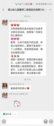 家长会结束后,各班班级群纷纷收到家长们对我们工作的认可和感谢。家长们对老师认真细致的工作给予高度肯定,对幼儿长期以来取得的进步表示感谢,对幼儿园丰富的活动表示赞许,纷纷表示要继续支持幼儿园和老师的工作,共同促进幼儿成长。