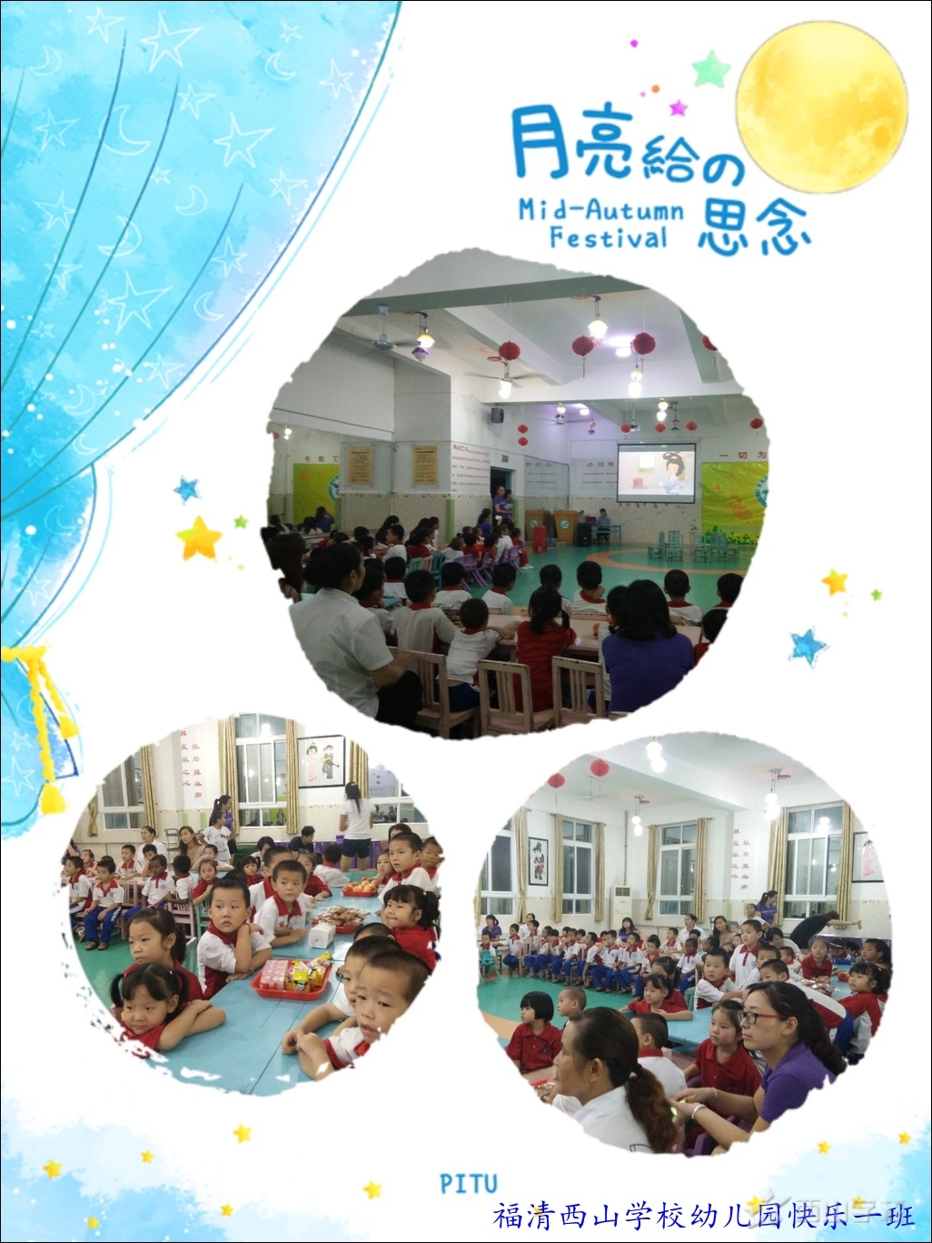 活动的幼儿园二楼多媒体活动室开展,通过观看视频让幼儿了解中秋节的来历。孩子们欢聚一堂,唱歌、跳舞、玩游戏、品月饼、赏月亮等一系列活动感受中秋节的氛围,在活动中体验分享、团结、合作的快乐。